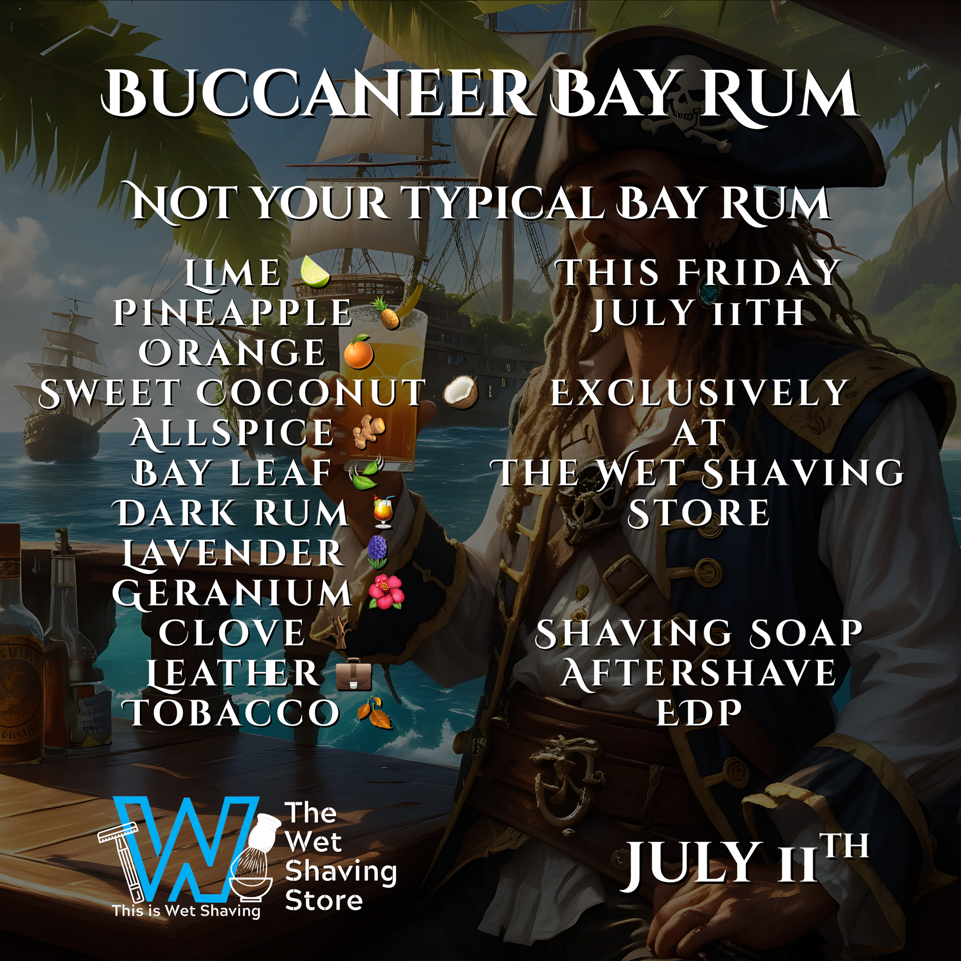 The scent? A tropical voyage in every jar — opening with a splash of 🍋 lime, 🍍 pineapple, and 🍊 orange, drifting into 🥥 sweet coconut, 🌿 bay leaf, and warm allspice, and anchored by bold notes of 🥃 dark rum, 🌸 lavender, 🌺 geranium, 🧥 leather, 🪵 clove, and tobacco. It’s bold, complex, and unapologetically adventurous.